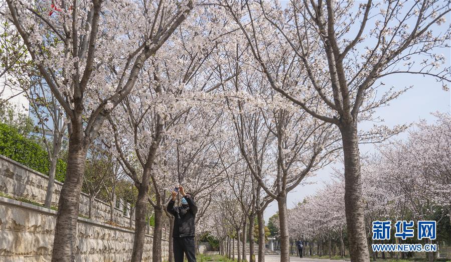 3月19日,在武漢市武昌區被網友稱為“武漢最美停車場”的湖北日報停車場,一名工作人員在拍攝櫻花。 新華社記者 才揚 攝