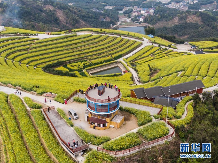 3月25日,游客在新登鎮(zhèn)上旺村黑山頂觀景臺觀賞油菜花海(無人機照片)。新華社記者徐昱攝