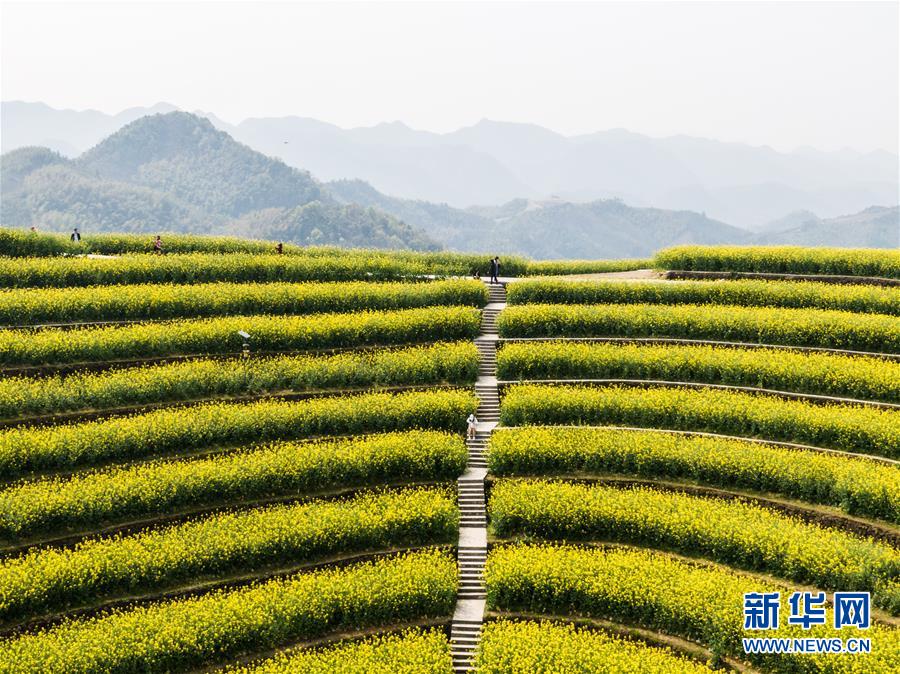 3月25日空中俯瞰新登鎮上旺村黑山頂的油菜花海(無人機照片)。新華社記者徐昱攝