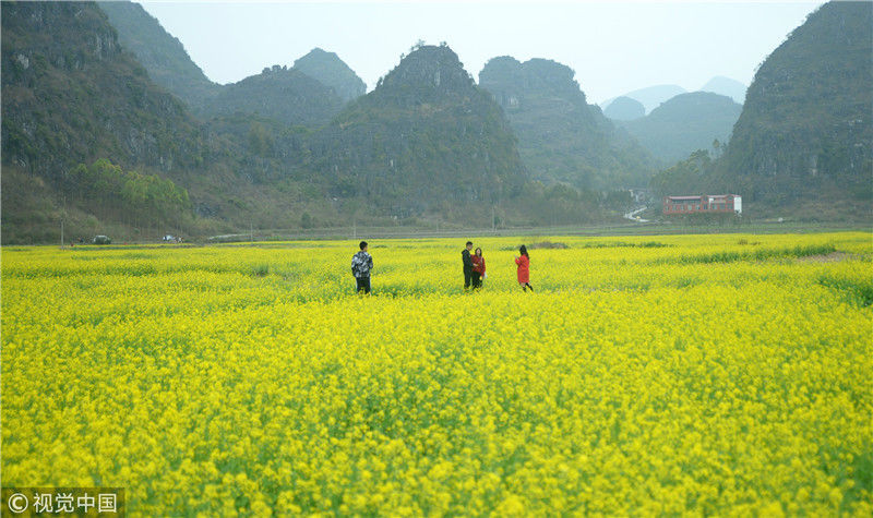 2019年2月5日,春節期間,廣西來賓市忻城縣萬余畝油菜花競相綻放,吸引眾多游客前來賞花游玩,感受春天的氣息。近年來,廣西忻城縣大力實施鄉村振興戰略,注重發展鄉村旅游產業,把鄉村旅游與美麗鄉村、脫貧攻堅緊密結合起來,輻射帶動當地貧困戶脫貧致富。樊紹光/視覺中國