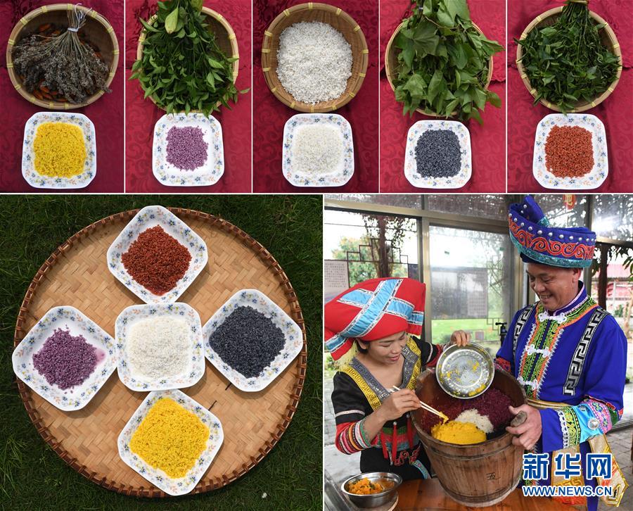 上五圖:4種不同植物及其色素染成的糯米和原色糯米;下左圖:4種不同植物色素染成的糯米和原色糯米;下右圖:在廣西上林縣巷賢鎮(zhèn),兩名壯族村民在查看一桶剛剛蒸熟的五色糯米飯(拼版圖片,3月25日攝)。每年“壯族三月三”到來(lái)之際,廣西的壯族同胞都有蒸制五色糯米飯迎接節(jié)日的習(xí)俗,以祈禱五谷豐登,五福臨門(mén)。這些五色糯米飯,主要采用天然植物萃取色素,將糯米分別浸泡到紫、黃、紅、黑4種不同植物色素的水里,充分染色后,與原色糯米一起蒸熟而成。色澤鮮艷、清香誘人的五色糯米飯,是“壯族三月三”接待來(lái)客時(shí)必不可少的傳統(tǒng)美食。新華社記者陸波岸攝