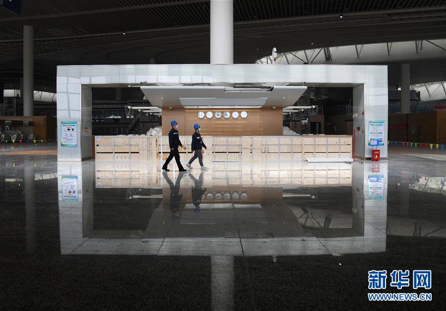 3月25日,兩名工人從建設(shè)中的青島膠東國際機(jī)場航站樓出發(fā)大廳走過。新華社記者李紫恒攝