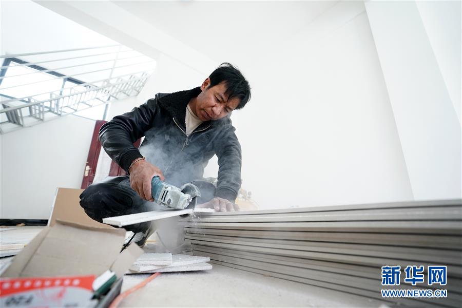 在拉薩市堆龍德慶區古榮鄉榮瑪高海拔生態搬遷點扶貧綜合門面房,尼加在為一家店鋪做裝修(4月2日攝)。2018年,尼加搬遷到榮瑪高海拔生態搬遷點后,和朋友合伙從事裝修工作。新華社記者 詹彥 攝