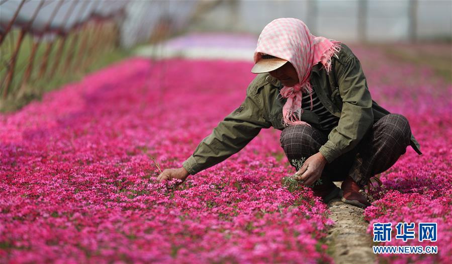 4月13日,在八角臺街道雅化村花圃內,花農為培育的宿根花卉除草。新華社記者姚劍鋒攝