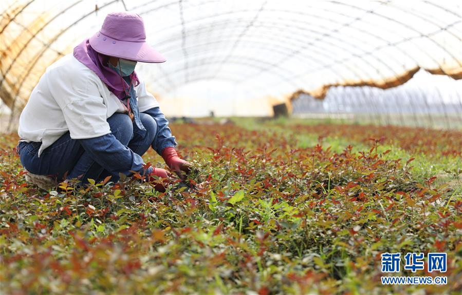 4月13日,在八角臺街道雅化村花圃內,一名花農整理宿根花卉。新華社記者姚劍鋒攝