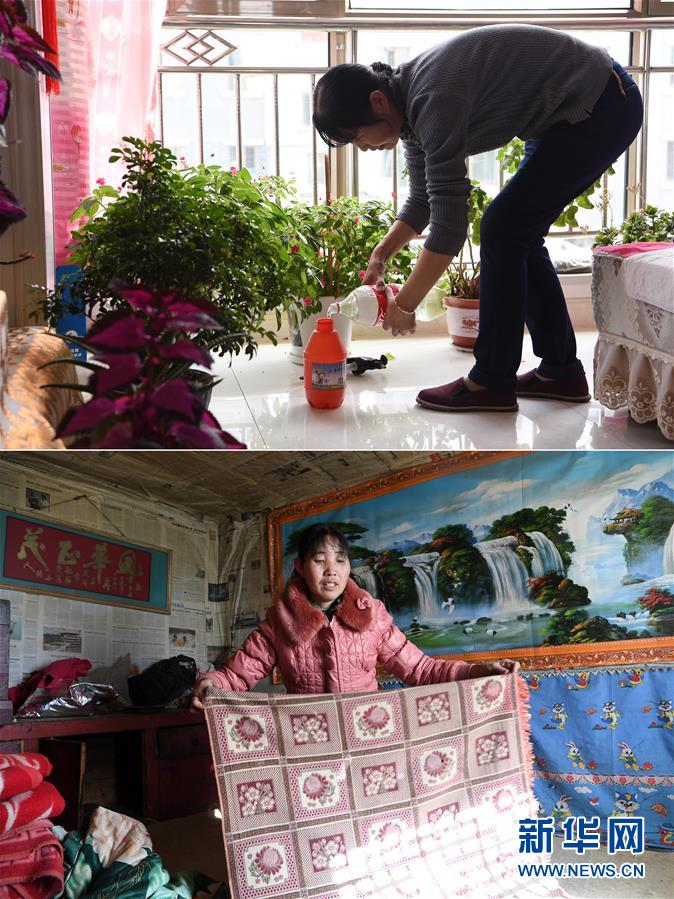拼版照片:上圖為胥存在古浪縣綠洲生態移民小城鎮的家中給客廳里的花澆水(4月7日攝);下圖為胥存在古浪縣黃羊川鎮石城村的家中疊床單(2018年2月6日攝)。新華社記者范培珅攝
