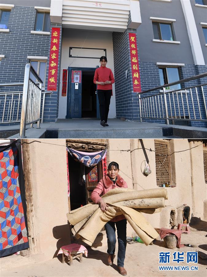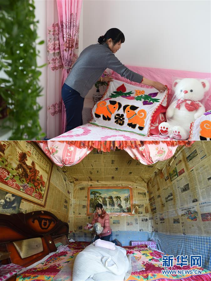 拼版照片:上圖為胥存在古浪縣綠洲生態移民小城鎮整理家中臥室(4月7日攝);下圖為胥存在古浪縣黃羊川鎮石城村收拾家中床上物品(2018年2月6日攝)。新華社記者范培珅攝