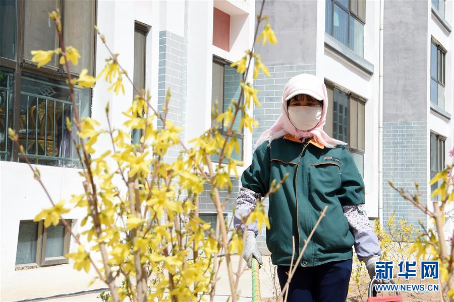 在古浪縣綠洲生態移民小城鎮,胥存打掃小城鎮花園衛生(4月7日攝)。新華社記者范培珅攝