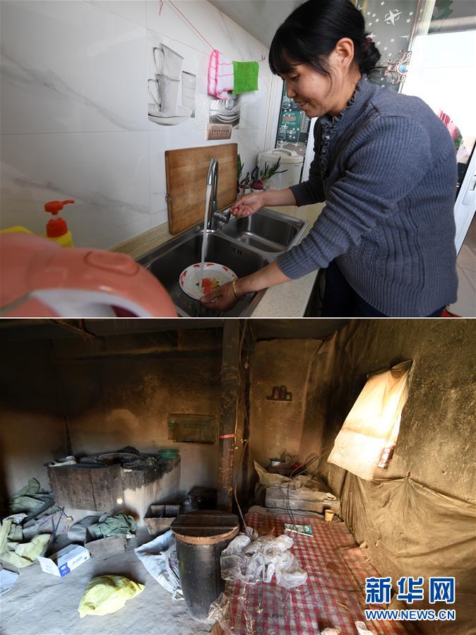 拼版照片:上圖為胥存在古浪縣綠洲生態移民小城鎮的家中廚房忙碌(4月7日攝);下圖為胥存在古浪縣黃羊川鎮石城村的家中廚房(2018年2月6日攝)。新華社記者范培珅攝