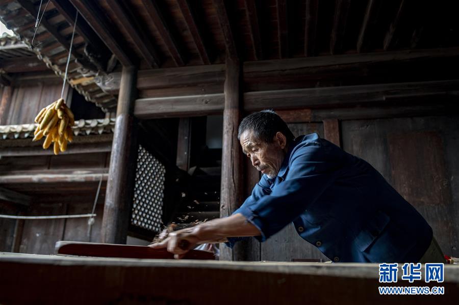 73歲的石屏縣異龍鎮符家營村村民楊國保在家中制作村里修整老屋所需的木梁(8月8日攝)。新華社記者江文耀攝