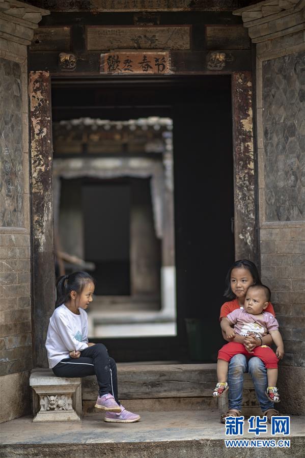 石屏縣異龍鎮符家營村的小朋友鄭淇(左)與小伙伴在村里的老屋門前休息(8月8日攝)。新華社記者江文耀攝