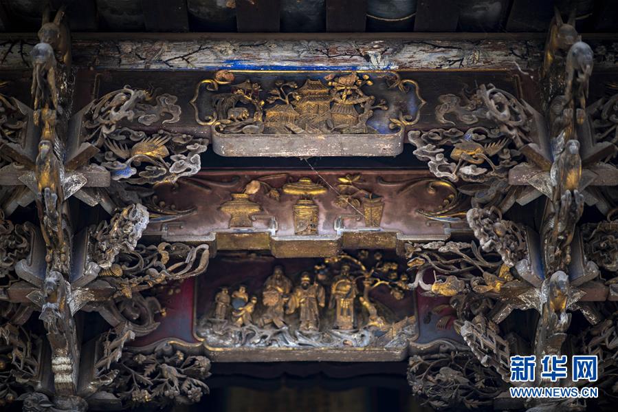 位于石屏縣異龍鎮符家營村一戶老屋中“修舊如舊”的房梁(8月8日攝)。新華社記者江文耀攝