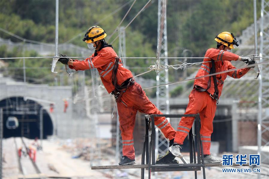 4月25日,在福建省寧德市屏南車站,施工人員開展接觸網調整作業。中鐵電氣化局集團上海公司推動衢寧鐵路福建段通信工程、信號工程、電力工程、電氣化工程各環節協同復工復產,目前來自河北、河南、四川等國內10個省的900多名員工返崗就業。衢寧鐵路北起浙江省衢州市,南至福建省寧德市,全長379.2公里。新華社記者彭張青攝