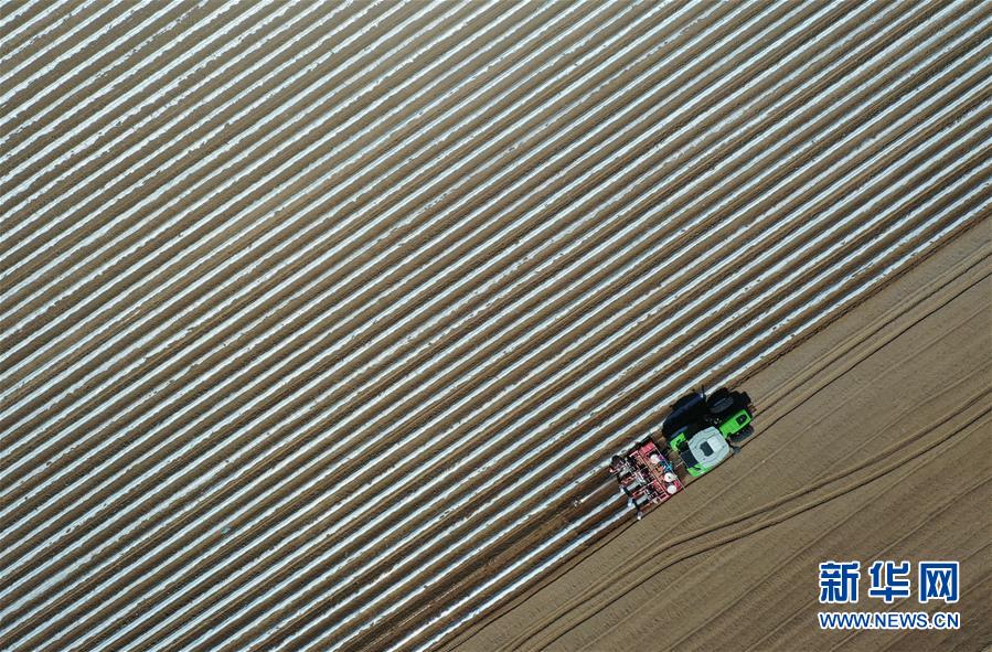 4月25日,灤南縣東黃坨鎮新戶村農民使用拖拉機給準備栽植煙薯秧苗的土地開溝覆膜(無人機照片)。近年來,河北省灤南縣利用當地土壤和氣候特點,引導農民因地制宜發展煙薯種植,取得良好效果。目前該縣煙薯種植面積達3萬多畝,每畝年收入達5000多元。新華社記者楊世堯攝