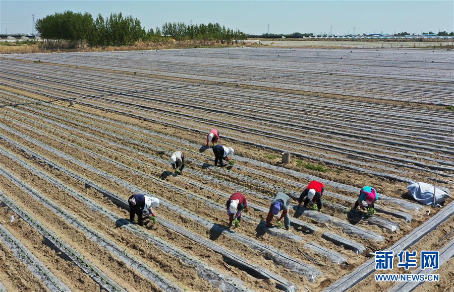 4月25日,灤南縣東黃坨鎮(zhèn)新戶村農(nóng)民在田間栽植煙薯秧苗(無(wú)人機(jī)照片)。近年來(lái),河北省灤南縣利用當(dāng)?shù)赝寥篮蜌夂蛱攸c(diǎn),引導(dǎo)農(nóng)民因地制宜發(fā)展煙薯種植,取得良好效果。目前該縣煙薯種植面積達(dá)3萬(wàn)多畝,每畝年收入達(dá)5000多元。新華社記者楊世堯攝