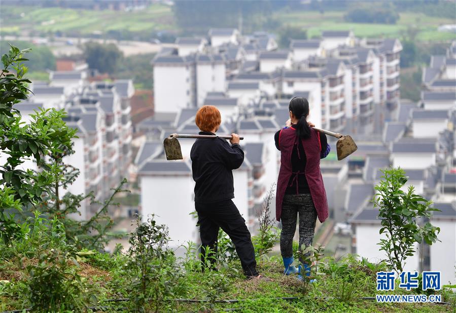 在廣西融水苗族自治縣縣城一處易地扶貧搬遷小區附近,45歲的楊美燕(左)和搬遷戶楊鮮花在農場里護理果樹(3月13日攝)。