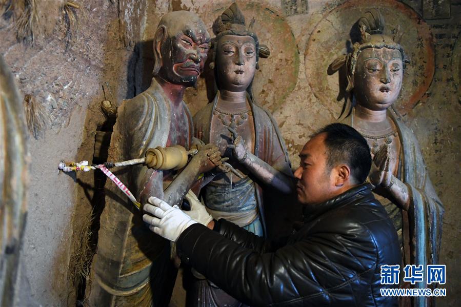 12月25日,在麥積山石窟第11窟,修復師牟常有查看一尊已經發生傾斜的塑像。新華社記者馬寧攝