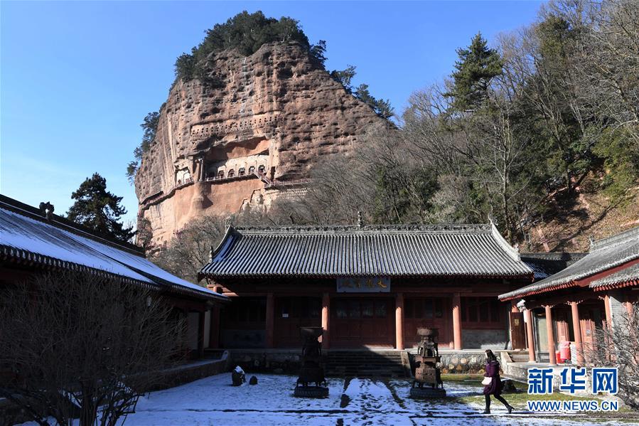 12月26日,游客在麥積山石窟參觀游覽。一場(chǎng)降雪過后,位于甘肅省天水市的麥積山石窟在晴空下尤為壯美。麥積山石窟是中國(guó)四大石窟之一,因其山形似麥垛而得名,現(xiàn)存窟龕221座。新華社記者馬寧攝