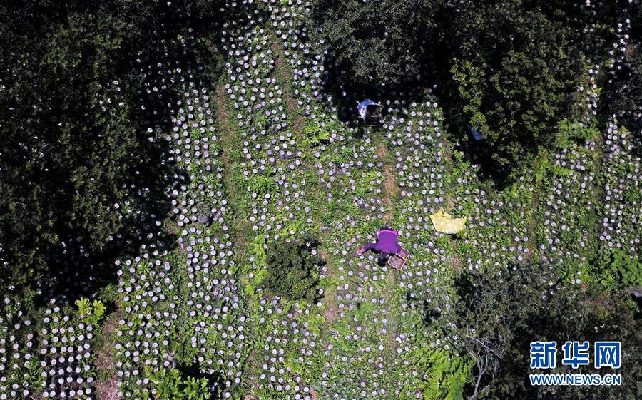 村民在劍河縣岑松鎮巫亮村林下仿野生食用菌基地采摘木耳(4月27日攝,無人機照片)。近年來,貴州省黔東南苗族侗族自治州劍河縣充分利用林下土地培育木耳,既不耽誤林木生長,又發展了食用菌產業。目前,該縣采取“龍頭企業+合作社+貧困戶”的合作模式,大力推廣林下木耳種植,帶動農民增收。新華社記者楊文斌攝