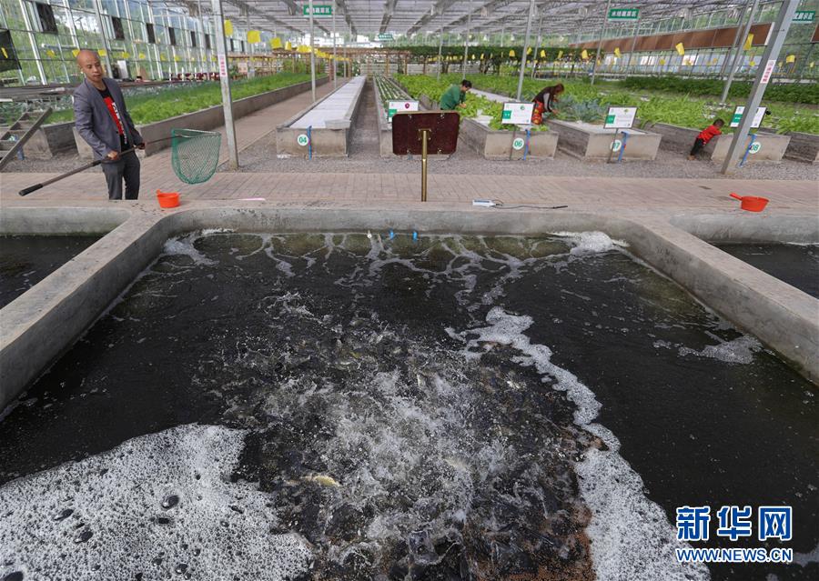 4月29日,在珙縣三合村現代農業產業示范園區,魚塘的廢水接入無土栽培蔬菜棚中進行養種循環利用。新華社記者江宏景攝