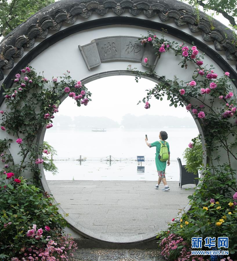5月5日,游客在西湖畔的郭莊觀看月季花展。“五一”期間,第八屆杭州西湖月季花精品展在杭州西子湖畔舉行,展出國內外700余個月季品種。新華社記者翁忻旸攝