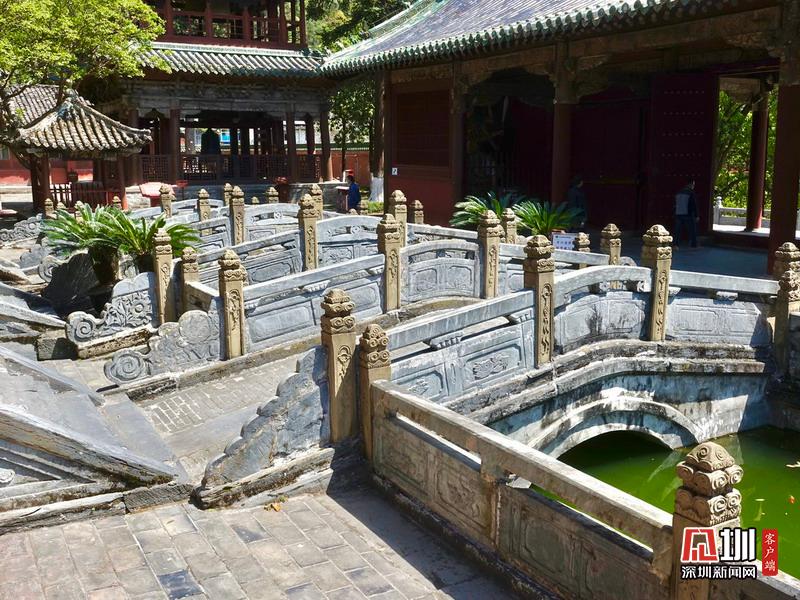 主體建筑布置在一條中軸線上,它坐西向東,由東而西次遞升高,寺前廣場上有“華表”兩座,寺內有“金水橋”三座,基本布局完全同于故宮前庭,山門外一對八字墻,形制也極似故宮的排場。主體建筑為大雄寶殿,以它為中心分為前中后三個院落。整個建筑群左右對稱,渾然一體,構成一座布局嚴謹、裝飾華麗的宮殿與寺廟特征兼備的古建筑群。李仁奇攝