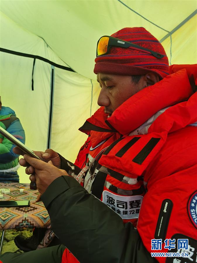 5月7日,登山隊(duì)隊(duì)長(zhǎng)次洛在前進(jìn)營(yíng)地查看攀登計(jì)劃。當(dāng)日,2020珠峰高程測(cè)量登山隊(duì)抵達(dá)海拔6500米的前進(jìn)營(yíng)地后,測(cè)量登山隊(duì)同由西藏圣山登山探險(xiǎn)服務(wù)有限公司的高山向?qū)Ш蛥f(xié)作隊(duì)員組成的修路隊(duì)、運(yùn)輸隊(duì)召開協(xié)調(diào)會(huì)議,布置下一步任務(wù)。新華社特約記者扎西次仁攝