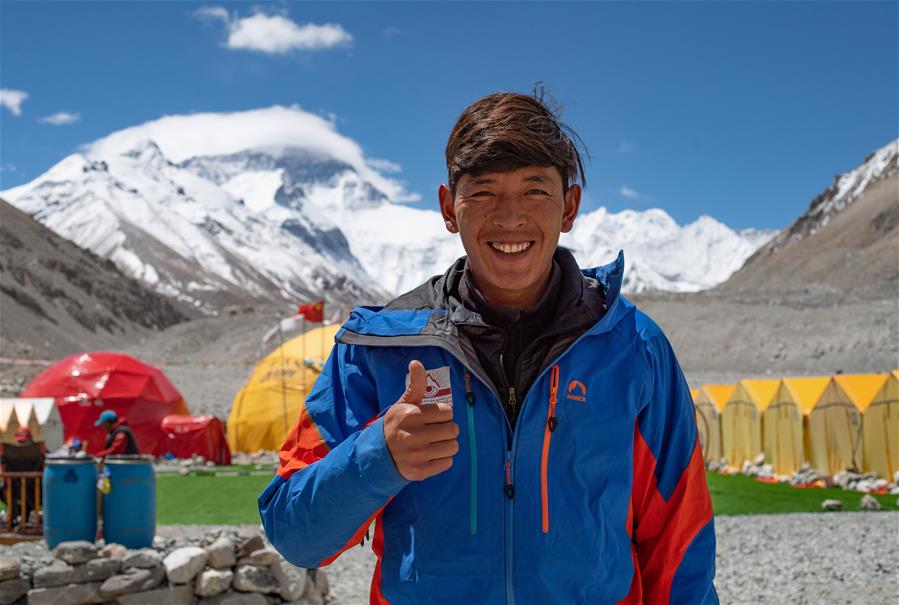 西藏圣山公司高山向導米瑪頓珠在珠峰大本營(5月8日攝)。5月8日是世界微笑日。在海拔5200米的珠峰大本營,參與2020珠峰高程測量的各方人員,微笑期待本次測量活動的圓滿成功。