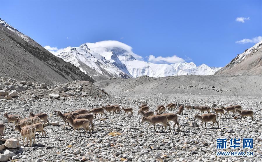 一群巖羊在珠峰大本營附近覓食(5月8日攝)。當日,一群巖羊在珠峰大本營周圍覓食,黃嘴山鴉飛到巖羊身上停留,構成一幅幅生動有趣的雪域圖畫。新華社記者普布扎西攝