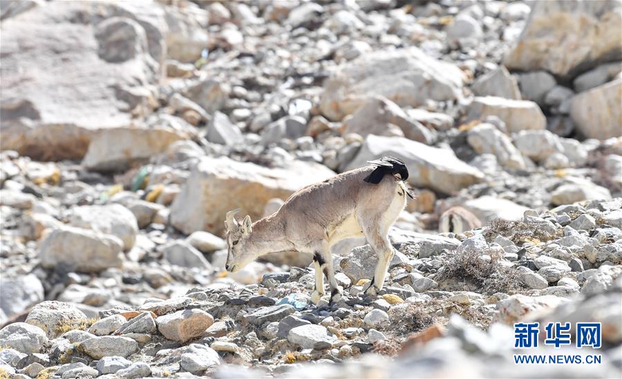 黃嘴山鴉停在巖羊背上(5月8日攝)。當日,一群巖羊在珠峰大本營周圍覓食,黃嘴山鴉飛到巖羊身上停留,構成一幅幅生動有趣的雪域圖畫。新華社記者普布扎西攝