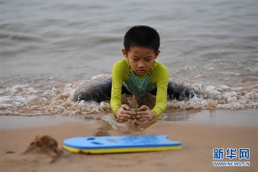 5月10日,小朋友在海口西秀海灘玩耍。近日,海口持續高溫,不少市民前往海灘戲水消暑。新華社記者蒲曉旭攝