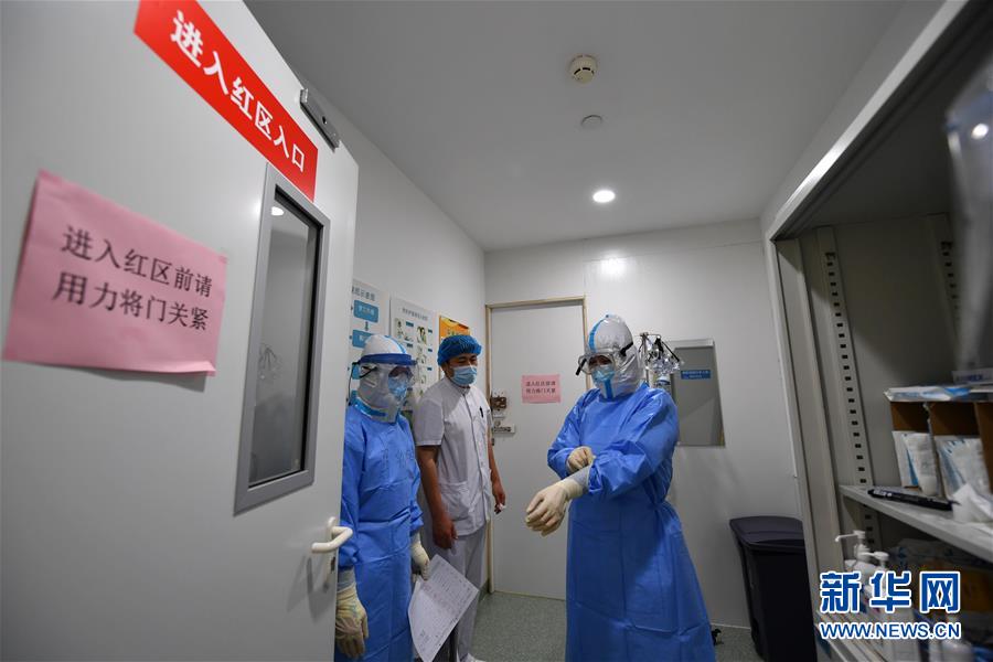 5月11日,在空港醫院隔離病房,穿戴好防護服的醫護人員準備進入“紅區”。