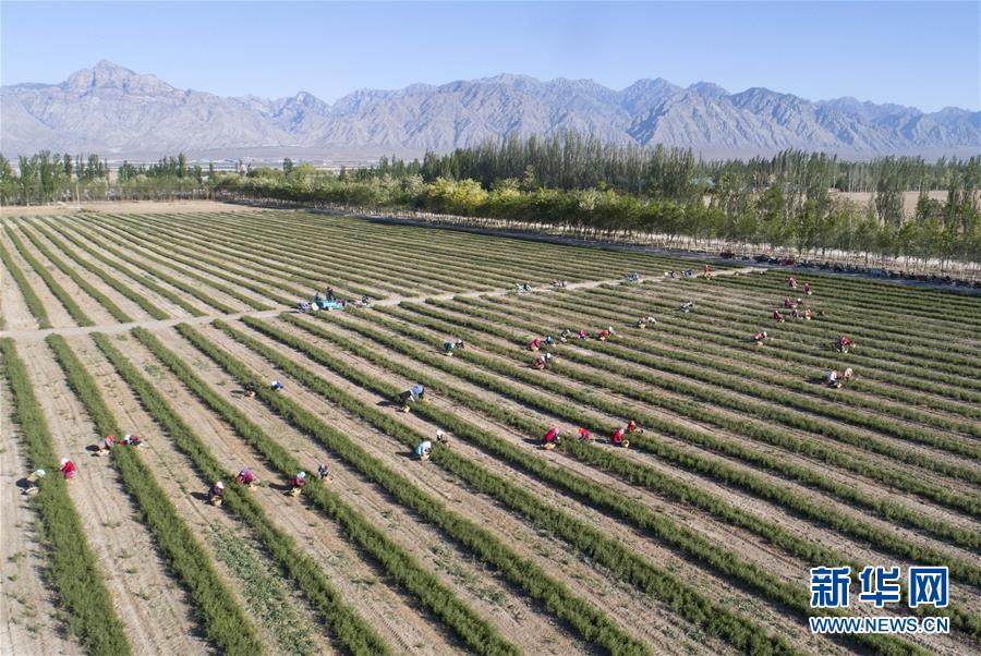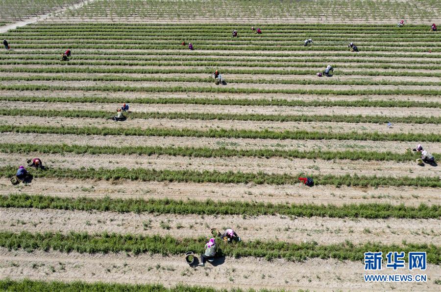5月11日,采茶工在寧夏百瑞源賀蘭山基地采摘枸杞芽茶(無人機照片)。當日,寧夏百瑞源賀蘭山基地枸杞芽茶全面進入采摘季。據了解,該基地茶園面積300余畝,助力附近200多名農民就業增收。新華社記者楊植森攝