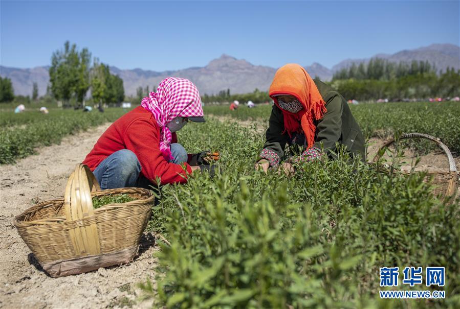 5月11日,采茶工在寧夏百瑞源賀蘭山基地采摘枸杞芽茶。當日,寧夏百瑞源賀蘭山基地枸杞芽茶全面進入采摘季。據了解,該基地茶園面積300余畝,助力附近200多名農民就業增收。新華社記者楊植森攝