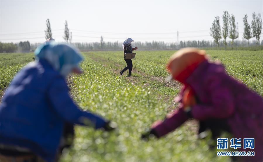 5月11日,采茶工在寧夏百瑞源賀蘭山基地采摘枸杞芽茶。當日,寧夏百瑞源賀蘭山基地枸杞芽茶全面進入采摘季。據了解,該基地茶園面積300余畝,助力附近200多名農民就業增收。新華社記者楊植森攝
