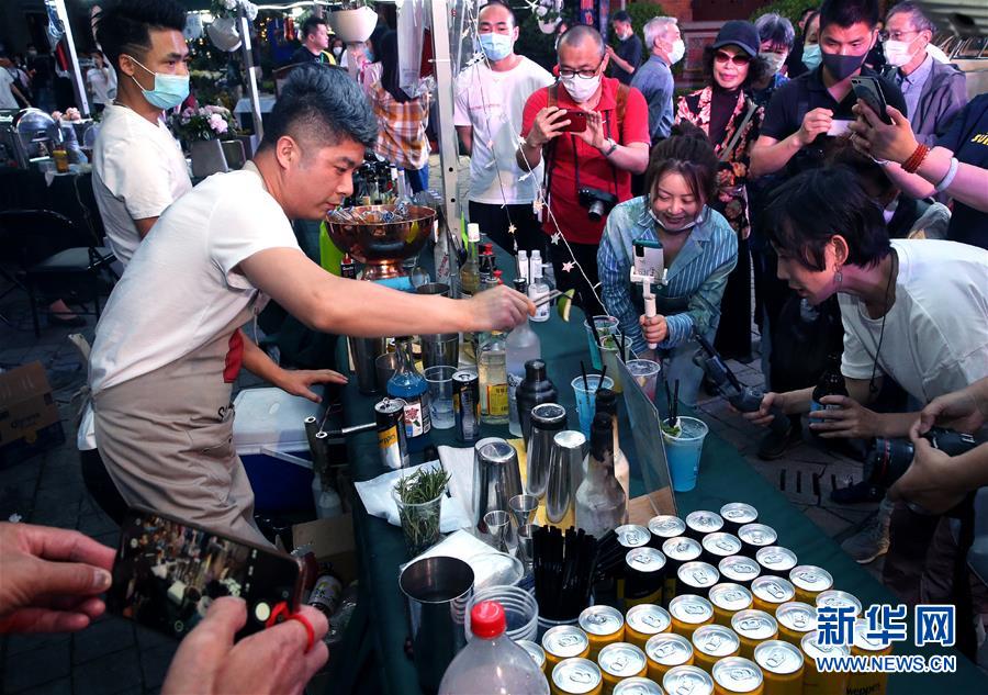 5月24日,調酒師在上海思南公館露天夜市進行網絡直播。入夏以來,上海思南公館推出“思南夜派對”夜間經濟大排檔,包括生活市集、深夜食堂、夜游露天博物館等板塊,匯集了國潮品牌、創意美食、藝術衍生品等攤位,為公眾帶來一站式夜間休閑“加油站”,促進夜間消費。新華社記者陳飛攝