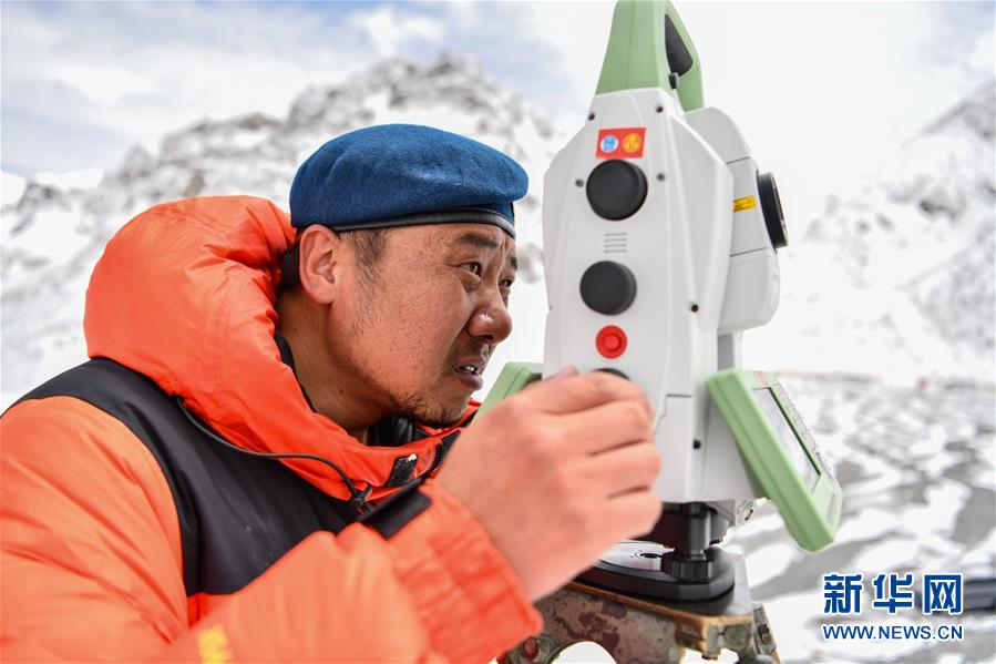 自然資源部第一大地測量隊隊員鄭林在使用全站儀對珠峰峰頂進行交會觀測(5月27日攝)。新華社記者晉美多吉攝