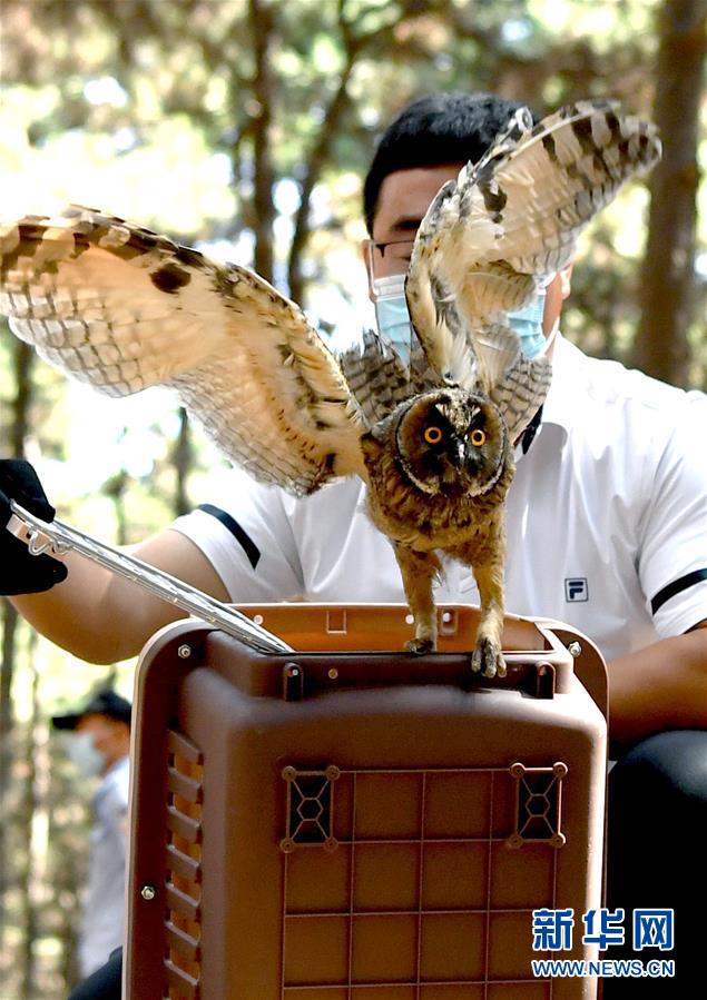 7月1日,吉林省野生動物救護繁育中心工作人員放飛一只長耳鸮。新華社記者林宏攝