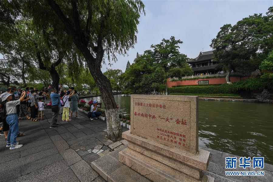 7月1日,游客游覽嘉興南湖景區的中共一大會址。新華社記者徐昱攝