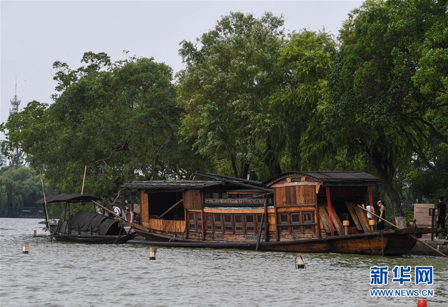 7月1日,嘉興南湖景區內停泊的中共一大紀念船。新華社記者徐昱攝
