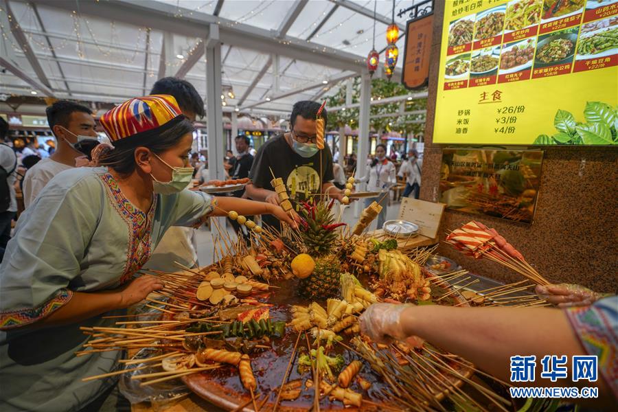 游客在烏魯木齊大巴扎景區挑選麻辣燙(7月4日攝)。夏日周末,烏魯木齊市大巴扎景區內熙熙攘攘,人們來到這里品嘗美食、休閑購物。2018年,經過靚化改造后的大巴扎景區新增長約800米的步行街,分為文創文旅和“非遺”項目街區、國際時尚街區和大巴扎美食街區,是烏魯木齊最受歡迎的旅游目的地之一。新華社記者趙戈攝