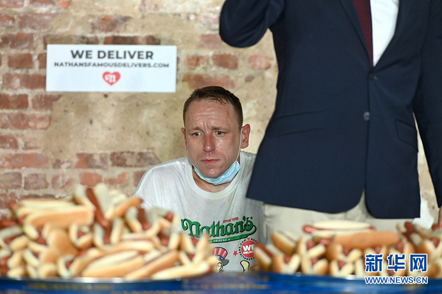7月4日,美國紐約布魯克林舉行一年一度的國際吃熱狗比賽,喬伊·切斯納特以吃75個熱狗的成績贏得男子賽區冠軍,創下了新的世界紀錄。(圖片來源:視覺中國)