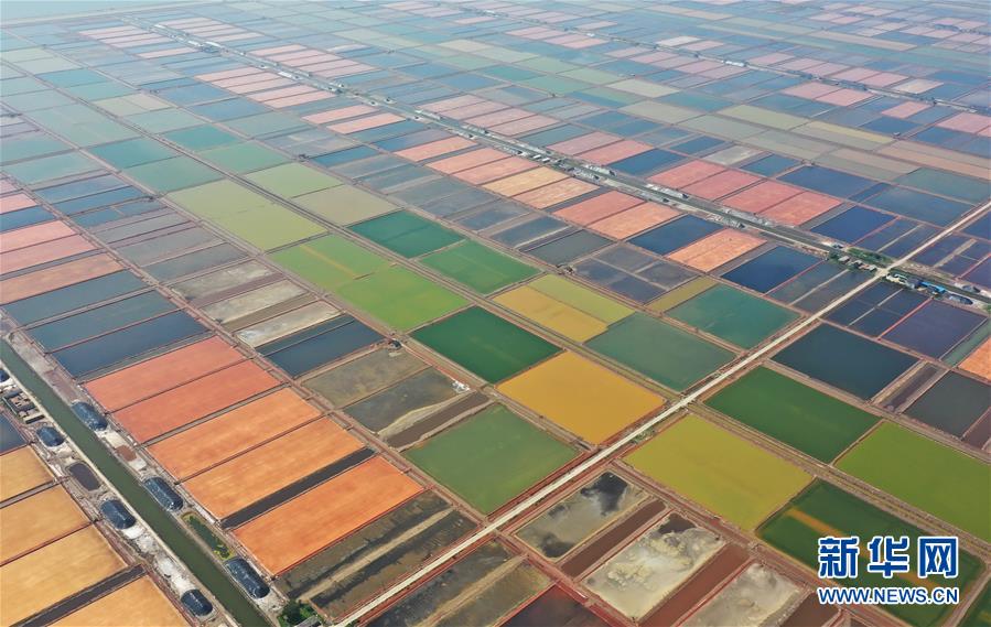 7月9日拍攝的唐山市曹妃甸區南堡鹽場鹽田(無人機照片)。在我國長蘆鹽區海鹽生產基地之一的河北省唐山市曹妃甸區南堡鹽場,一年一度的春鹽收獲工作即將結束,今年南堡鹽場的春鹽產量預計可達72萬噸。新華社記者楊世堯攝
