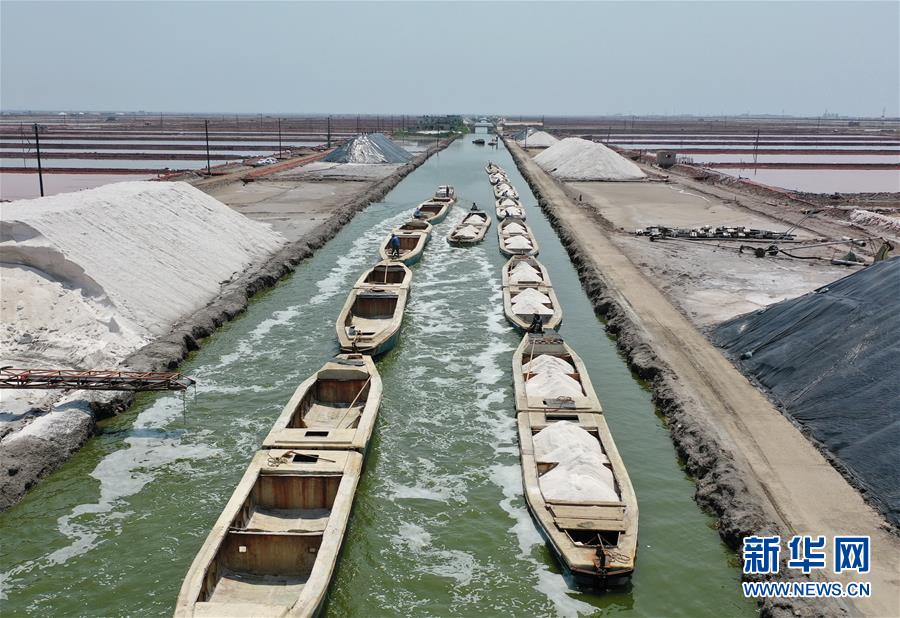 7月9日,唐山市曹妃甸區南堡鹽場的工人將收獲的春鹽裝船。在我國長蘆鹽區海鹽生產基地之一的河北省唐山市曹妃甸區南堡鹽場,一年一度的春鹽收獲工作即將結束,今年南堡鹽場的春鹽產量預計可達72萬噸。新華社記者楊世堯攝