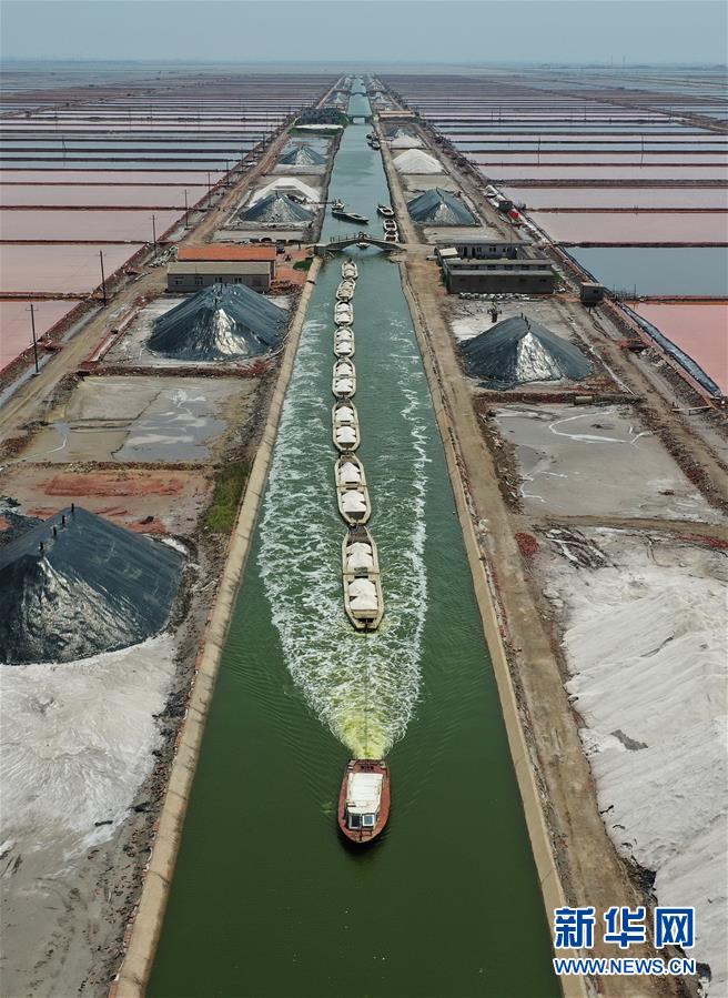 7月9日,唐山市曹妃甸區南堡鹽場的運鹽船只在運輸河道內行駛(無人機照片)。在我國長蘆鹽區海鹽生產基地之一的河北省唐山市曹妃甸區南堡鹽場,一年一度的春鹽收獲工作即將結束,今年南堡鹽場的春鹽產量預計可達72萬噸。新華社記者楊世堯攝