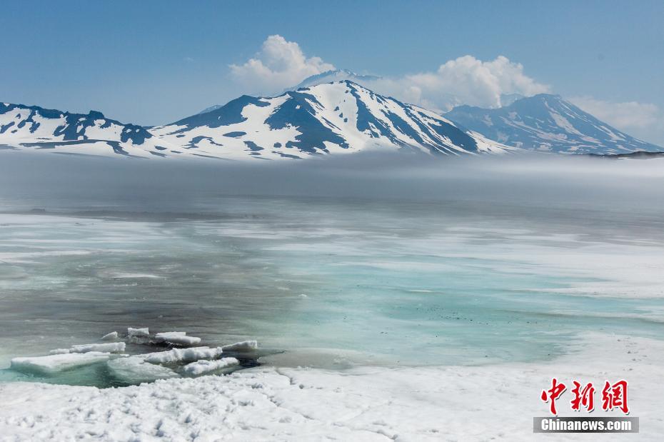 俄羅斯“冰封”火山一片純白 融雪形成火山湖