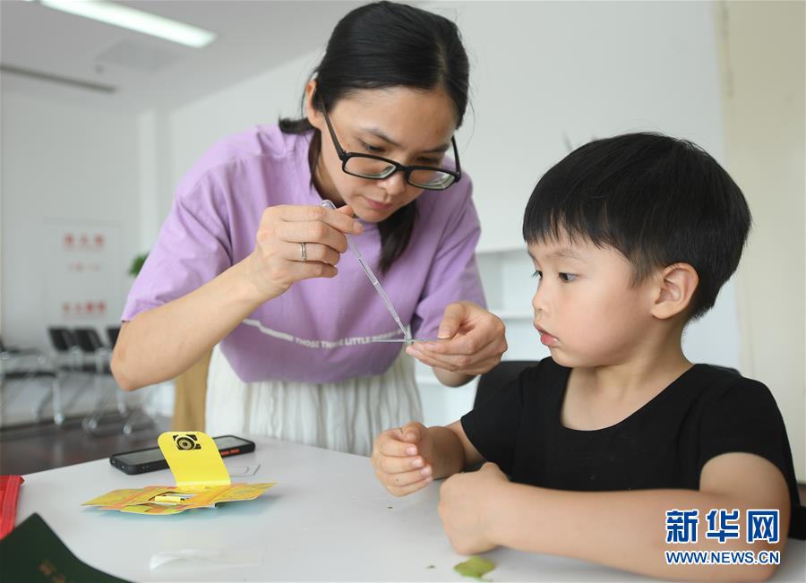 7月27日,導師帶領小朋友制作植物標本。新華社記者 翁忻旸 攝