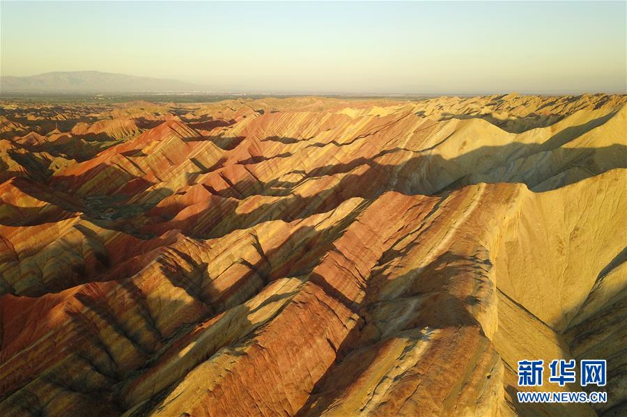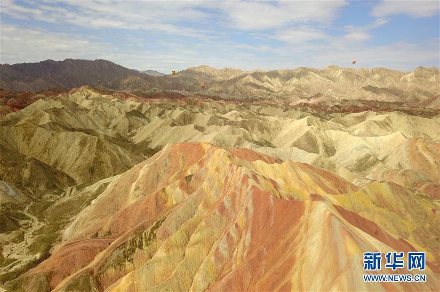 這是7月27日拍攝的張掖世界地質(zhì)公園七彩丹霞景區(qū)景觀(guān)(無(wú)人機(jī)照片)。新華社記者 范培珅 攝