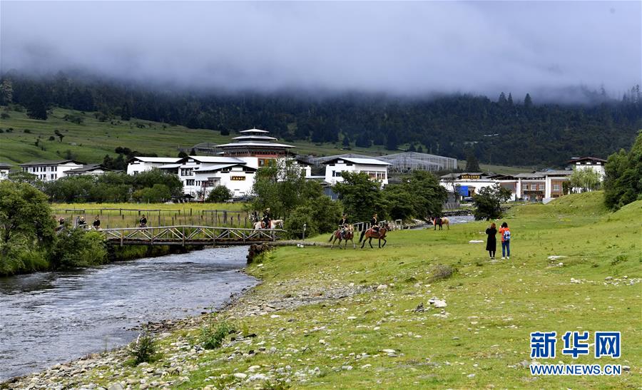 農牧民在魯朗旅游小鎮騎行(7月26日攝)。新華社記者 張汝鋒 攝