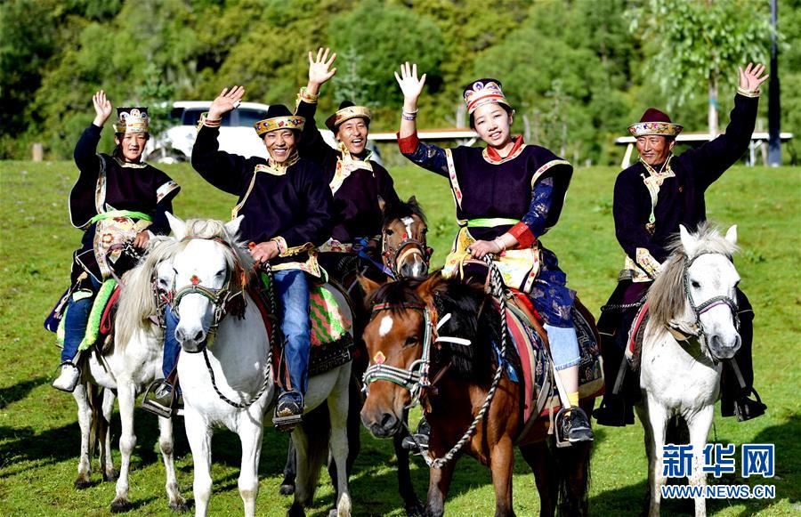 魯朗旅游小鎮農牧民向游客招手致意(7月26日攝)。新華社記者 張汝鋒 攝